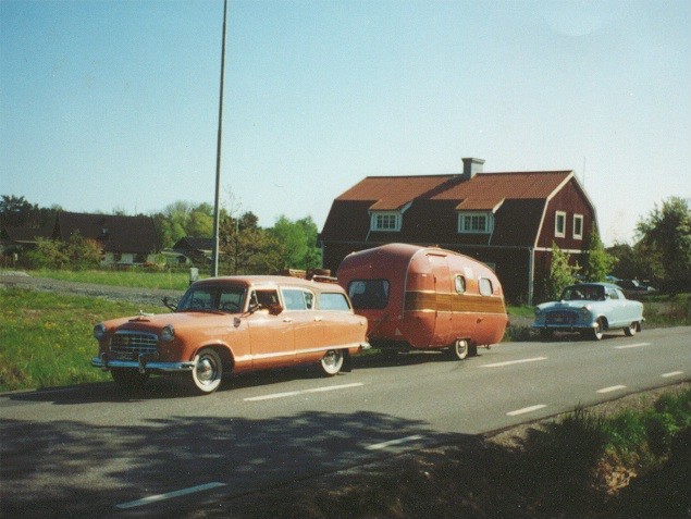 This photo is from Arkösund just 50 meters from where Karl-Erik and his family live. The caravan is made in 1963 in Örebro and it´s an SMV caravan (really a very popular caravan). The Ramblers have the same kind of engine, 90 hp 6 cylinder side valve motor. They have gone less than 10000 swedish miles before restoration. (I think about 59000 miles) The Hudsons motor was in a very very bad condition and so was the body. The Nash engine was a bit better but its body was very rusty. But both cars were in a very good inner condition. Their upholsterings were almost as new. But Karl-Erik and his wife gave them new inner roofs. All inner metal parts, panels and so on have the original color, never repainted. In the background you can see his Hudson Rambler also from in 1955. Both of them were in a terrible condition when Karl-Erik got them four or five years ago.