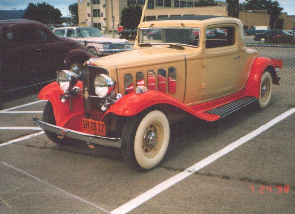 The car is a 1932 second series model 1082R, (R for rumble seat) 128" wheelbase. It has an eight cylinder OVH engine of 260 cubic inches, worm drive rear end and originally equiped with free wheeling transmission but presently equiped with overdrive transmission. The wheels are era aftermarket sold by tire dealers (Firestone, Goodrich, etc) and were called "Jumbos" with a new low pressure tire mounted on them.
